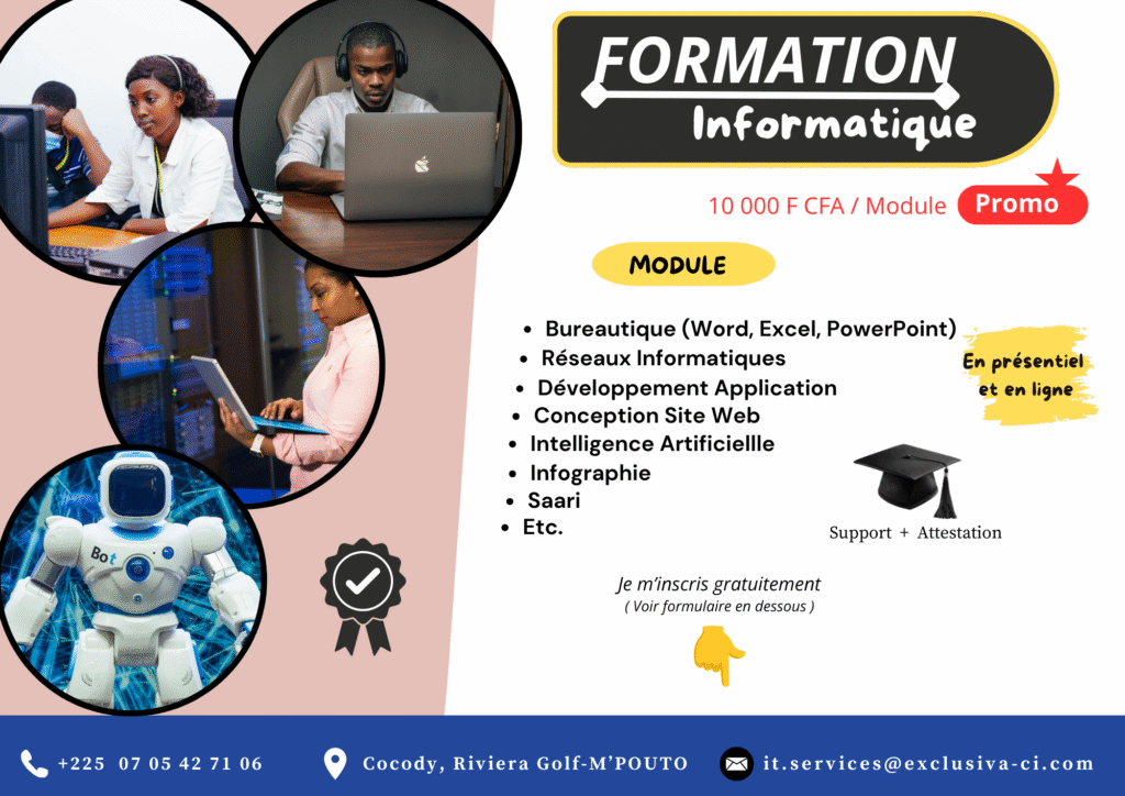 INSCRIPTION GRATUITE ( 10 000 f cfa / Module & 30 000 f cfa / Cours ) Veuillez activer JavaScript dans votre navigateur pour remplir ce formulaire.Veuillez activer JavaScript dans votre navigateur pour remplir ce formulaire.Nom *PrénomNomTéléphone (WhatsApp) * formation la de Email *Choisir la formation *— Sélectionner un choix —WordExcelPowerPointRéseaux InformatiqueCAFOPENSENAMéthode de formation *En PrésentielEn LigneCommentaireEnregistrer